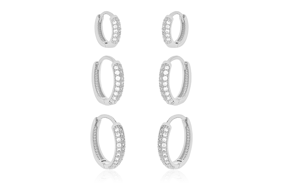 BRINCO EM PRATA, ARGOLINHA CLICK COM 3 FILEIRAS DE ZIRCÔNIAS, 9mm DIÂMETRO