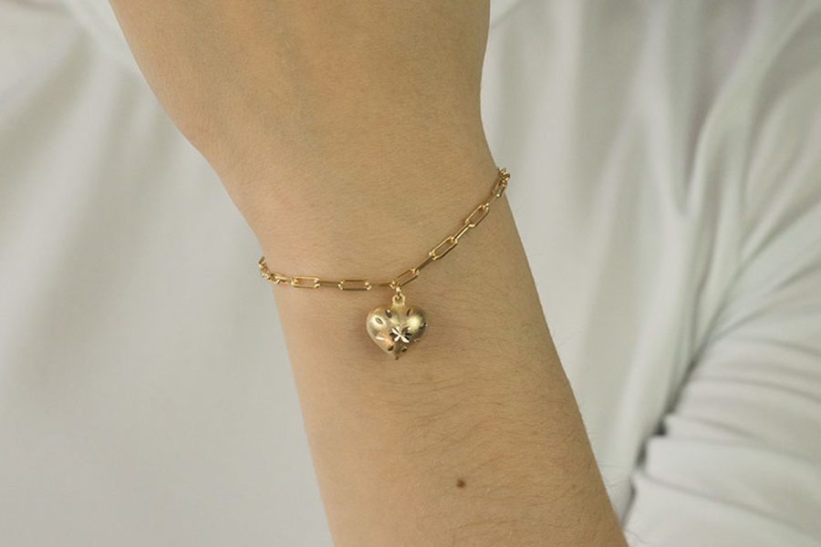 PULSEIRA BANHADA EM OURO, INFANTIL, ELO CARTIER 6,50x2,90mm E CORAÇÃO 12,50mm LARGURA