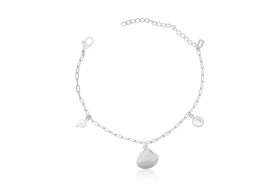 PULSEIRA BANHADA EM PRATA LEVE, ELO CARTIER 5x2mm, 16cm COMPRIMENTO, EXTENSOR 5cm, CONCHA, PÉROLA SHELL 6mm E PONTO DE LUZ