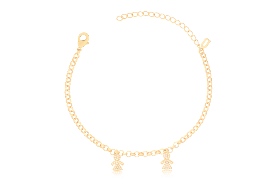 PULSEIRA BANHADA EM OURO, ELO PORTUGUÊS 3,20mm, 16cm COMPRIMENTO, EXTENSOR 5cm E DUAS MENINAS