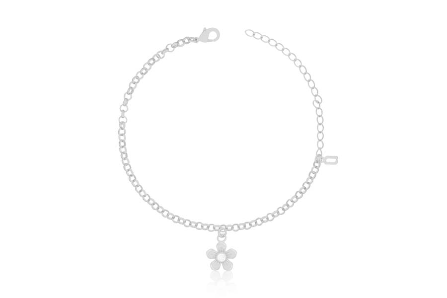 PULSEIRA BANHADA EM RÓDIO BRANCO, ELO PORTUGUÊS 2,50mm, 16cm COMPRIMENTO, EXTENSOR 5cm E FLOR 10mm
