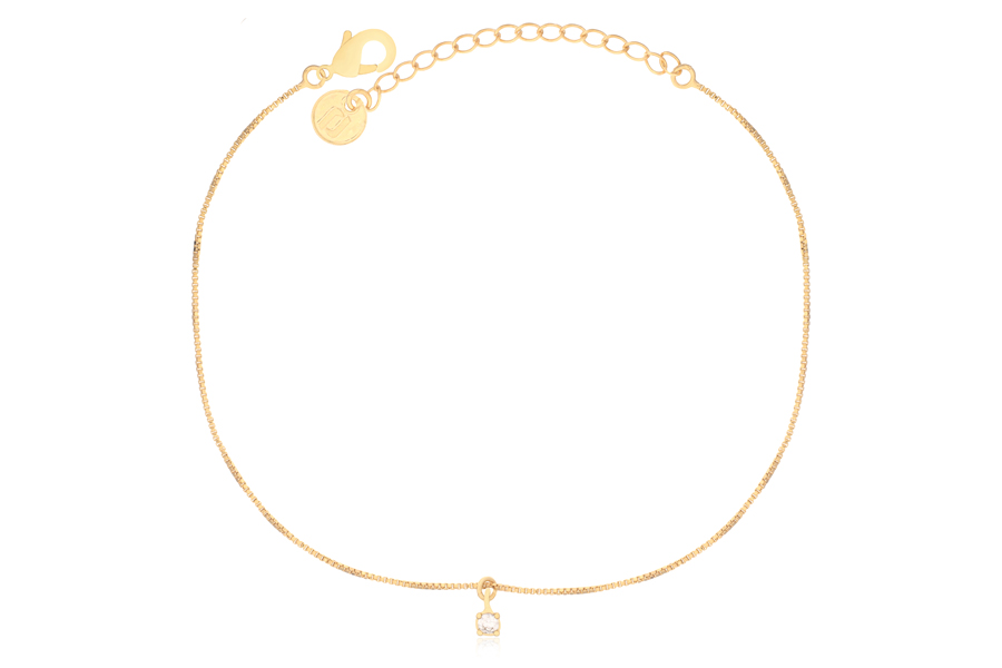 TORNOZELEIRA BANHADA EM OURO, ELO VENEZIANA 0,80mm, 23cm COMPRIMENTO, EXTENSOR 5cm E PONTO DE LUZ 3mm