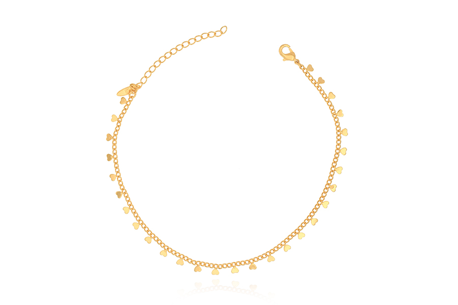 TORNOZELEIRA BANHADA EM OURO, ELO CORRENTE COM CORAÇÃO, 21cm COMPRIMENTO E EXTENSOR 5cm COMPRIMENTO